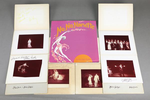 No No Nanette Originaly Broadway 1971 Revival Cast Autographs, original photos of the cast; autographs include: Miss Patsy Kelly, Helen Gallager & Bobby Van, Ruby Keeler, & Benny Baker; autographed Vinyl Cover included as well; please inspect. These items have not been authenticated by a third party. They are being sold as-is as a group and are not subject to return. We make every attempt to offer original signatures but in group lots we encourage the buyer to use their judgment. Shipping charges apply - weight 2 lbs. (PDF for this Lot) (PDF2 for this Lot) (Image)