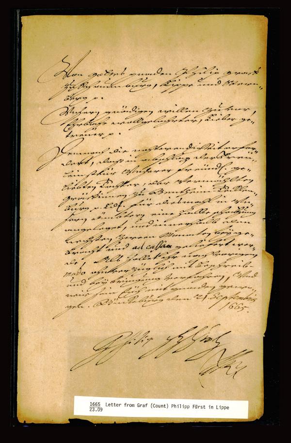 1665 Signed Letter from Count Philipp Fürst in Lippe of North Rhine-Westphalia, This 1665 letter written and sent by Graf (County) Philipp Fürst in Lippe, North Rhine-Westphalia. It is in good condition and features the original wax seal on the front of the folded cover. This item has been pre-certified from scans by leading authority and authenticator John Reznikoff at johnreznikoff.com. For a full certificate at a special discounted rate which requires sending the item in, contact john@universityarchives.com. (Image)