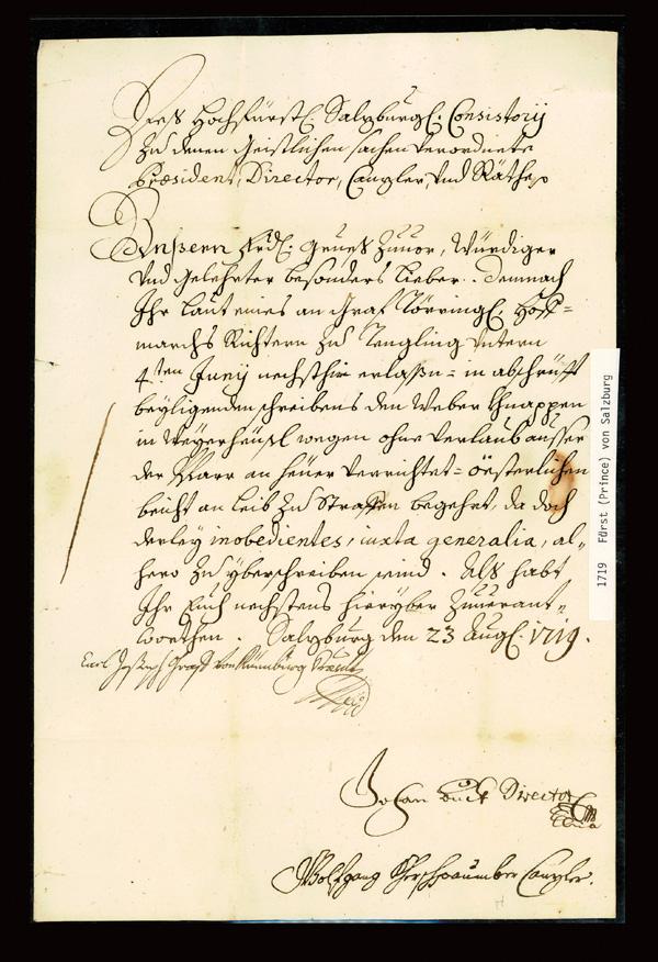 1719 Signed Letter from Prince von Salzburg of the Holy Roman Empire, This 1719 letter written and sent by Fürst (Prince) von Salzburg of the Holy Roman Empire. It is in good condition and features the original wax seal on the front of the folded cover, albeit broken. This item has been pre-certified from scans by leading authority and authenticator John Reznikoff at johnreznikoff.com. For a full certificate at a special discounted rate which requires sending the item in, contact john@universityarchives.com. (Image)