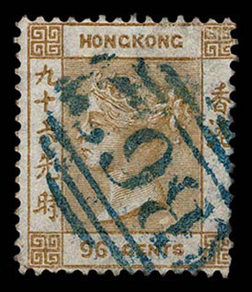 HONG KONG: 1865 96c bister, neat blue "N62" in grid cancel, fresh and fine. (Scott 23 $950 ) Sale and Lot Updates Scott $950 (Image)