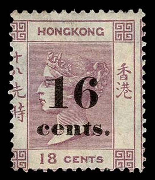 HONG KONG: 1877 16c on 18c lilac, trace of gum, fine. (Scott 29 $3,000 ) Sale and Lot Updates Scott $3,000 (Image)