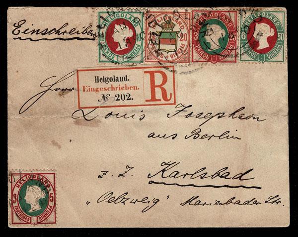 HELIGOLAND used to Czech Republic: 1875-90; 5pf. 10pf, 25pf, 50pf all tied on off-white Registered envelope, tied by HELIGOLAND AUG 9, 1890 c.d.s. strikes bearing manuscript Einschreiben and red registry label, on reverse KARLSBAD 8 __ 90 circular receiver, post office notice accompanies. (SG 13-17 £1with cover premium) SG 13-17 £320 as used x 3) Sale and Lot Updates SG £320 (Image)