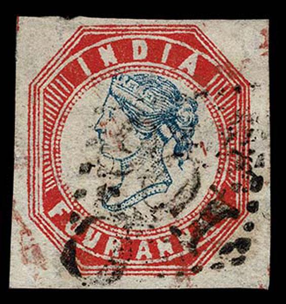 INDIA: 1854 4a blue & red, Head die III, Frame die II indistinct cancel, good margins all around, very fine. (SG 23 £750 (Scott 6F $575 SG) Sale and Lot Updates Scott $575 (Image)