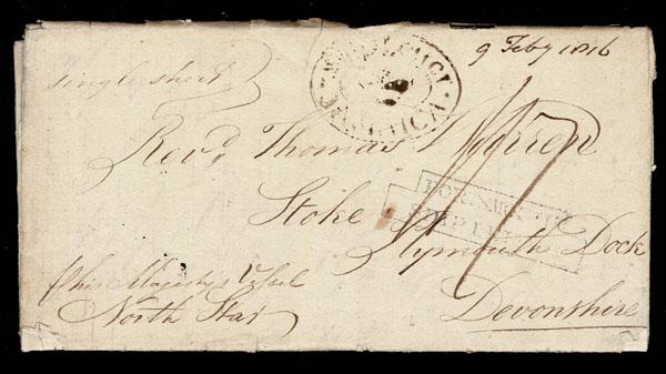 , also boxed “PORTSMOUTH SHIP LETTER / Crown”, ms “per Majesty’s vessel North Star and manuscript 1/7, on reverse JAMAICA 10 FEB fleuron.
