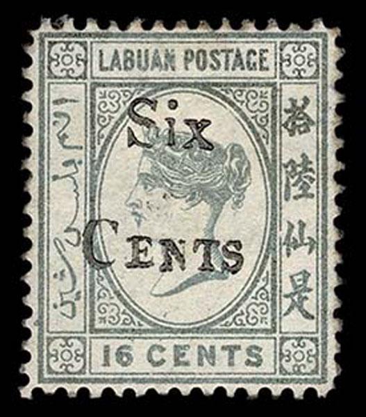 LABUAN: North Borneo: 1893 Six Cents on 16c gray, o.g., well centered, fresh and very fine. (SG 50 £350) Scott 41 $450 ) Sale and Lot Updates Scott $450 (Image)