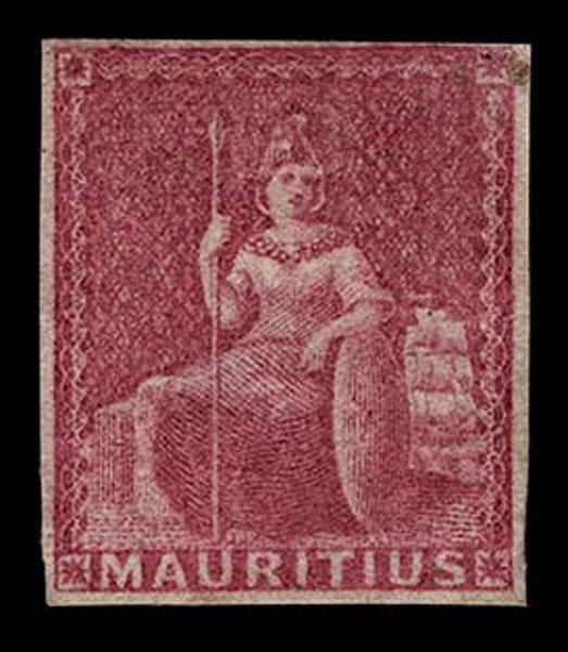 MAURITIUS: 1859; 9p magenta , part o.g. hinge remnant, margins all around, bright color tiny stain spot, still very fine. (Scott 11 $850 ) Sale and Lot Updates Scott $850 (Image)