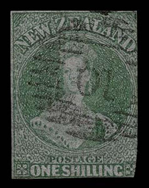 NEW ZEALAND: 1855 1s yellow green, blued paper, faint STAR watermark, light "10" in grid postmark, good margins two sides, traces at bottom, vertical crease, fine appearance. (SG 3 £6,500) Scott 3 $6,000 ) Sale and Lot Updates Scott $6,000 (Image)