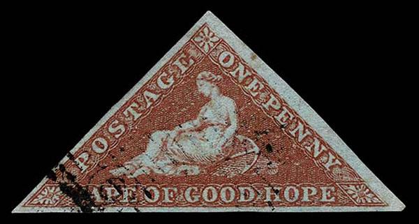 CAPE OF GOOD HOPE: 1853 “Triangular”, Perkins Bacon printing,1d pale brick red on deeply blued paper, good to large margins all around, lovely light small triangular obliterator leaving the figure of “Hope” clear, extremely fine. (SG 1 £450 ) Sale and Lot Updates SG £450 (Image)