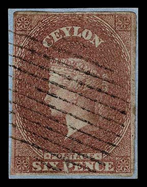 CEYLON: 1857 -59, 6p brown, good margins all around, tied on a piece by neat bar cancel. A true imperforate, very fine. (Scott 7 $700 ) Sale and Lot Updates Scott $700 (Image)