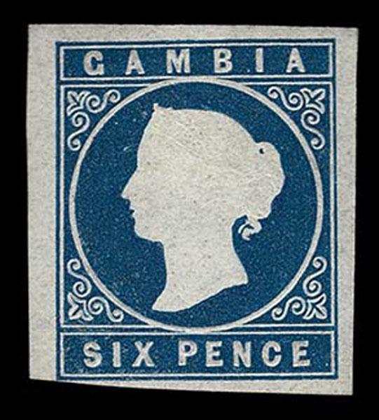GAMBIA: 1869 4p pale brown and 6p blue, , o,g, hinge remnant, margins large to touching (4p), fresh colors, fine 2 copies. (Scott 1,2, $1,225 ) Sale and Lot Updates Scott $1,225 (Image)