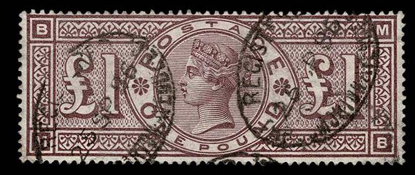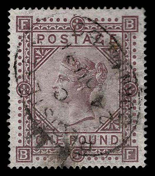 GREAT BRITAIN: 1878 £1 brown lilac, indistinct oval cancel, wrinkles, very well centered, almost very fine. (SG 129 £4,000) (Scott 75 $5,250 ) Sale and Lot Updates Scott $5,250 (Image)