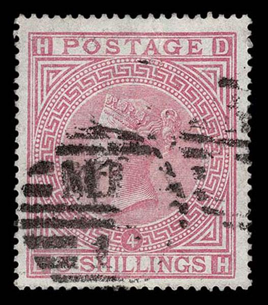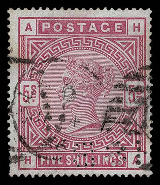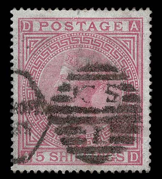 GREAT BRITAIN: 1882, 5s rose on white paper, Anchor watermark, indistinct grid cancel, light ms only on reverse from cover , fresh and almost very fine. (SG 134 £3,800 ) Sale and Lot Updates SG £3,800 (Image)