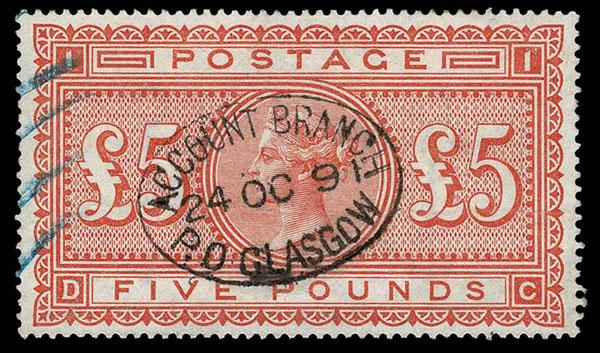 GREAT BRITAIN: 1882 £5 bright orange, absolutely perfect, "ACCOUNT BRANCH " 24 OCT 9 P,O, GLASGOW" oval, fresh bright color and pure white paper, neat accent crayon , extremely fine. (SG 137 £3,600) (Scott 93 $4,100 )