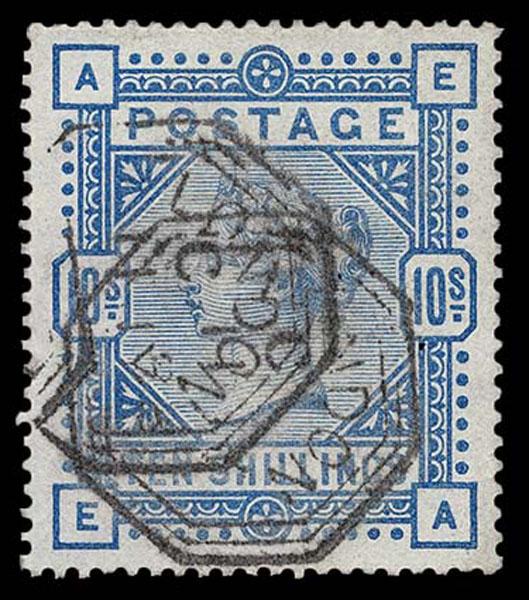 GREAT BRITAIN: 1882-84, 10sh ultramarine, octangular LONDON cancels, well centered. (SG 183 £250 ) Sale and Lot Updates SG £250 (Image)