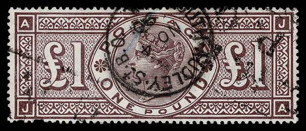GREAT BRITAIN: 1884, £1 brown lilac,crisp SOUTH AUDLEY ST NO4, 1890 c.d.s. and very faint “blue crayon mark”, bright color, well centered, very fine. Brandon Cert, (2004). (SG 185 £3,000 ) Sale and Lot Updates SG £3,000 (Image)