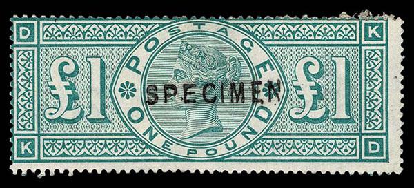 GREAT BRITAIN:1891 £1 green overprint SPECIMEN o.g. part hinge remnant, centered to top left, perf. faults and perforations, fresh. (SG 212S £1,100 ) Sale and Lot Updates SG £1,100 (Image)