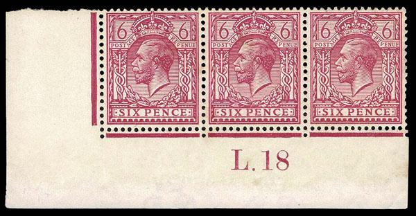 GREAT BRITAIN: 1913 6d red purple Bottom CORNER MARGIN STRIP OF THREE, with plate number £18, never hinged, extremely fine. (SG 185 £90 )