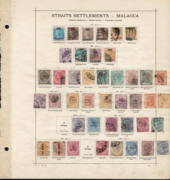 STRIAITS SETTLEMENTS & MALAYAN STATES: 1860's to 1910 Collection of 249 mostly used stamps on old-time Schaubek album pages, good overprints and surcharges with catalogue values of $100+, some stuck down by old-time hinges (should not affect used stamps), condition mixed but worth the effort to work the collection. Sale and Lot Updates Suggested Bid $750-1,000 (Image)