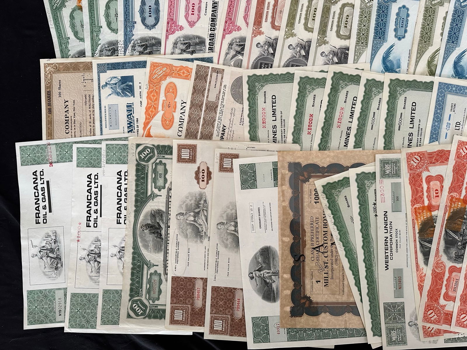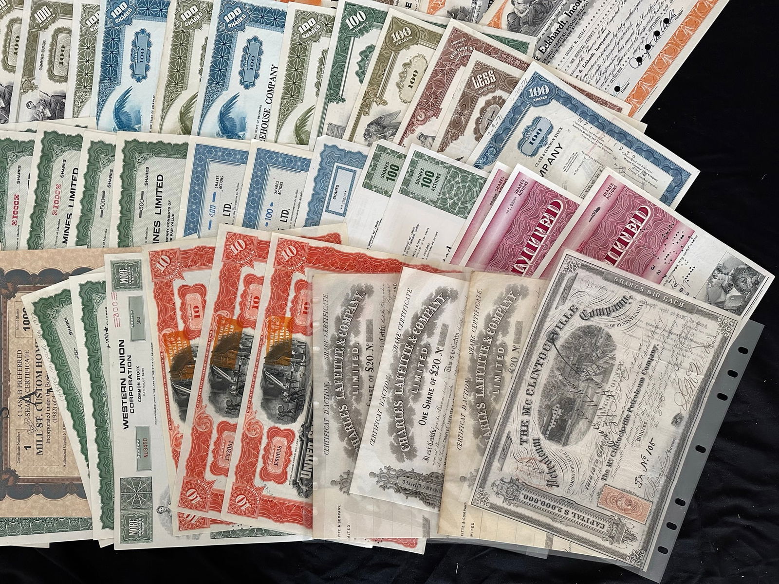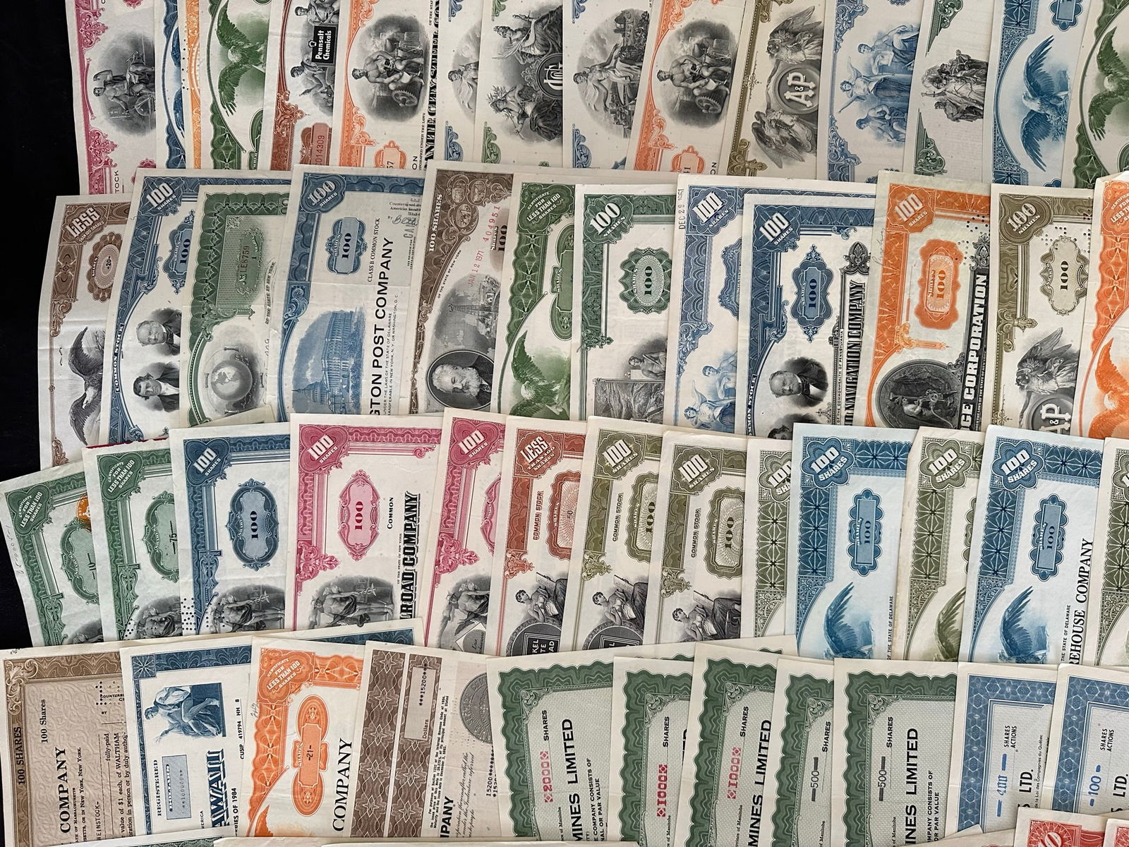 USA stock certificate collection consists of 155 stock certificates, with many highlights including one certificate stamped with a USA internal revenue stamp, and many notable corporations"s stock certificates including the preferred stocks of US Steel Corporation (1935),Western Union, and much more. The stocks feature beautiful artistic designs, and are a throwback to when hard copy stock certificates were used (compared to today's computer documentation). The certificates have great historical content, and relate to the financial challenges that existed during depressed circumstances and thus a a great collectable. (Image 1)(Image 2)(Image 3)(Image 4)(Image 5)(Image 6)(Image 7)(Image 8)(Image 9)(Image 10)