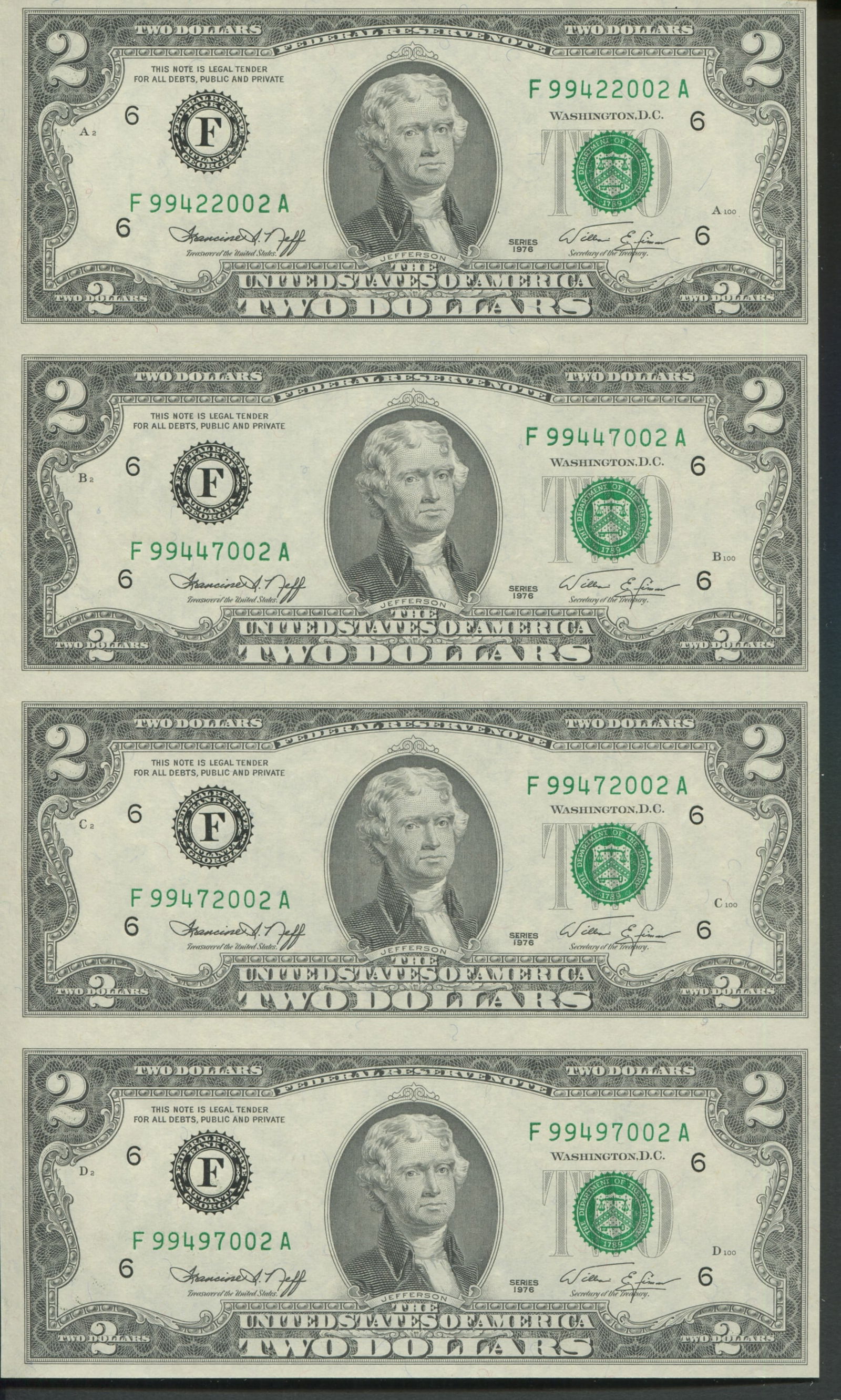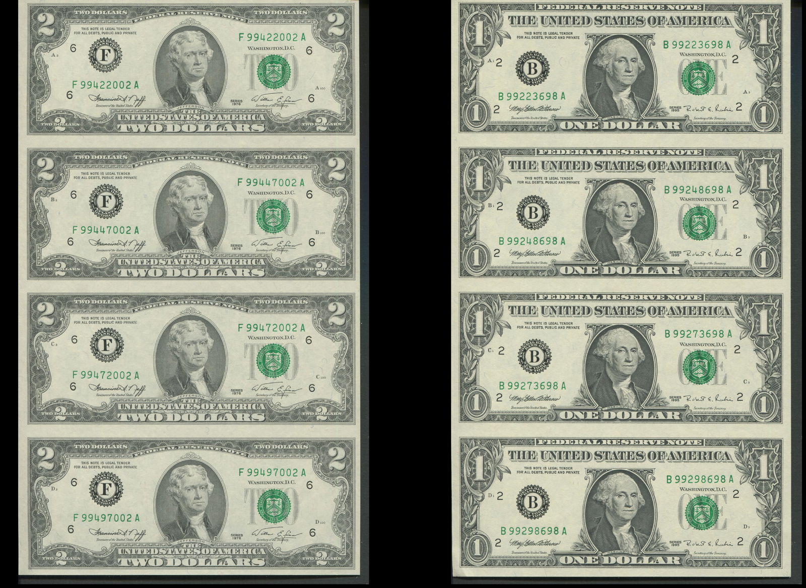 USA Bureau of engraving snf printing, consisting of 2 uncut sheets of 4, 1 $1.00 sheet and 1 2 dollar sdollar sheet.Both sheets in absolute gem condition, crisp and fresh.Includes the 2 Bureaudetailed documentaionand historical significance of the notes, truly worthy of being included in a bank note collectio. (Image 1)(Image 2)(Image 3)(Image 4)(Image 5)(Image 6)(Image 7)(Image 8)(Image 9)(Image 10)