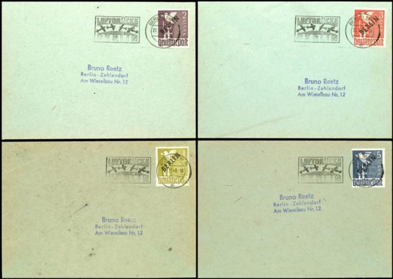 2 Pfennig to 5 Mark black overprint complete on 20 letters with airmail machine cancel, where all values except the 2 Pfennig were only cancelled with the date part of the postmark, would result in LUXURY letter pieces, photo certificate Eliades BPP, Michel loose 2. 600.- (previous starting price 500) (1/20) Certificate 2 Pfennig bis 5 Mark Schwarzaufdruck komplett auf 20 Briefen mit Luftbrücken-Maschinenstempel-Entwertung, wobei bis auf die 2 Pfennig alle Werte nur mit den Tagesstempelteil entwertet wurden, würden LUXUS-Briefstücke ergeben, Fotoattest Eliades BPP, Mi. lose 2.600.- (alter Ausruf 500) (Image)