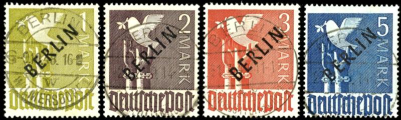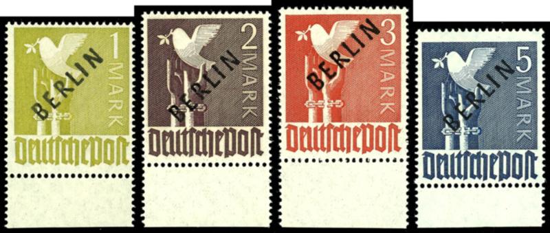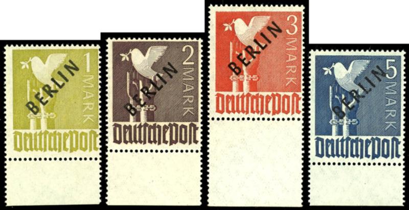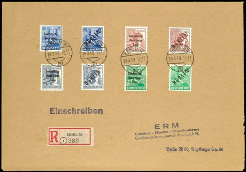 50 Pfennig - 84 Pfennig black print together with the same denominations of the Soviet Zone machine printing issue (Michel numbers 194-197) on collector registered mail within Berlin, postmarked March 19, 1949, flawless. (13/16) 50 Pfennig - 84 Pfennig Schwarzaufdruck zusammen mit den gleichen Wertstufen der SBZ-Maschinenaufdruck-Ausgabe (Mi.-Nr. 194-197) auf Sammler-Einschreiben innerhalb Berlins 19.3.1949 gelaufen, tadellos (Image)