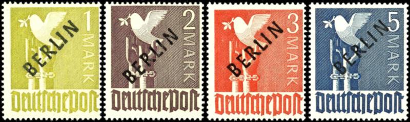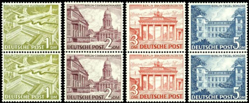 1 Mark Berlin buildings, falling watermark, block of four from the left edge of the sheet, mint never hinged, flawless condition, unsigned, Michel 600.- (57X(4)) 1 Mark Berliner Bauten, fallendes Wasserzeichen, Viererblock vom linken Bogenrand, postfrisch, tadellose Erhaltung, unsigniert, Mi. 600.- (Image)