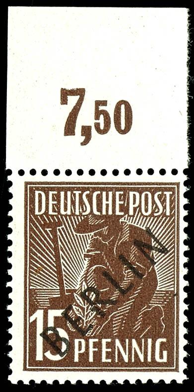 15 Pfennig black print, plate block top marginal piece ndgz, field 5, printing error IV \R broken\, occurring only in a partial edition, mint never hinged, flawless condition, photo certificate Schlegel BPP \The condition is impeccable.\ (6AFIVPORndgz) Certificate 15 Pfennig Schwarzaufdruck, Plattendruckoberrandstück ndgz, Feld 5, Aufdruckfehler IV \R gebrochen\ nur in einer Teilauflage vorkommend, postfrisch, tadellose Erhaltung, Fotoattest Schlegel BPP \Die Erhaltung ist einwandfrei.\ (Image)