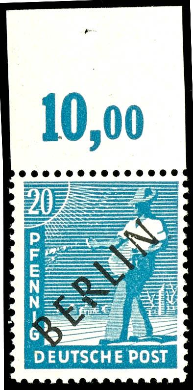 20 Pfennig black print, plate block top marginal strip ndgz, field 5, printing error IV \R broken\, occurring only in a partial edition, mint never hinged, flawless condition, certified by Schlegel BPP, Michel 250.- (8AFIV) 20 Pfennig Schwarzaufdruck, Plattendruckoberrandstück ndgz, Feld 5, Aufdruckfehler IV \R gebrochen\ nur in einer Teilauflage vorkommend, postfrisch, tadellose Erhaltung, geprüft Schlegel BPP, Mi. 250.- (Image)