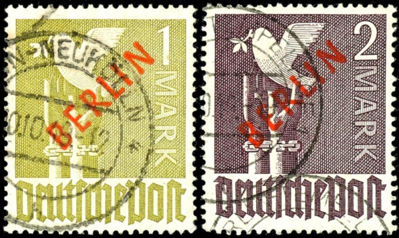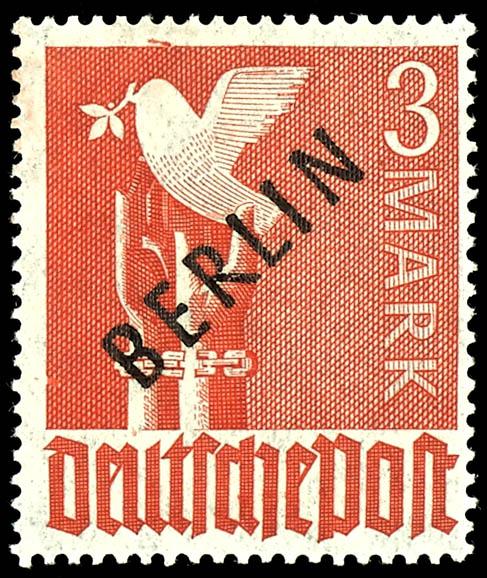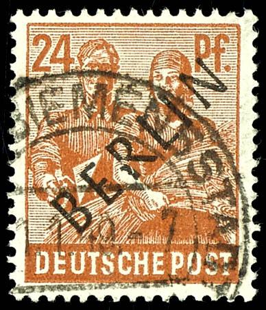 24 Pf, black print with plate flaw \R broken\, which only occurs in a partial edition. Fine strike, without plate flaw, postmarked \...Siemensstadt 11. 1. 49\, flawless. The Michel catalog lists it as -,- (as a reference, the Michel price for mint condition is 500,-). (9AF IV) 24 Pf. Schwarzaufdruck mit Plattenfehler \R gebrochen\, welcher nur in einer Teilauflage vorkommt. Plattenfehlerfrei gestempelt \...Siemensstadt 11.1.49\, einwandfrei, der Michel notiert nur -,- (als Anhaltspunkt Mi. für postfrisch = 500,-) (Image)