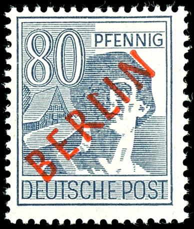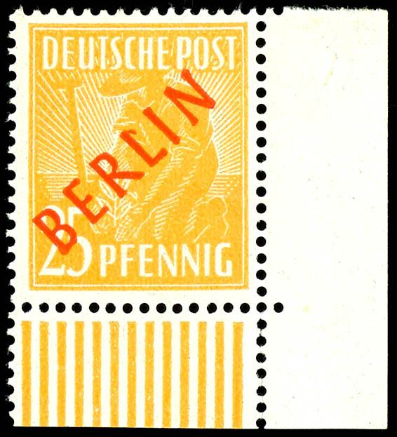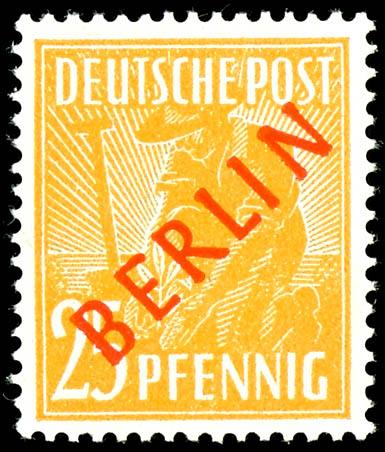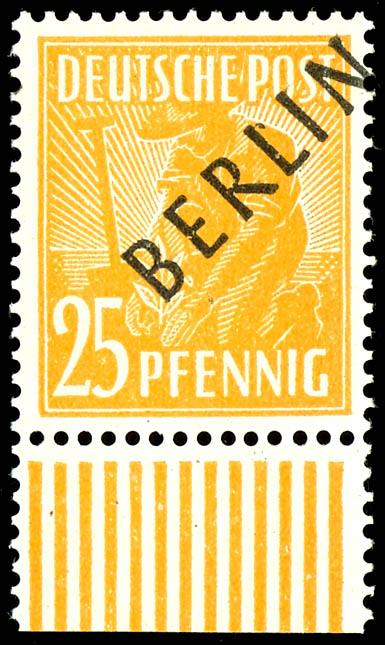 25 Pfennig black overprint, printing error I \L of BERLIN with apostrophe\, mint never hinged, flawless condition, certified by Schlegel BPP, Michel 120.- (10AFI) 25 Pfennig Schwarzaufdruck, Aufdruckfehler I \L von BERLIN mit Apostroph\, postfrisch, tadellose Erhaltung, geprüft Schlegel BPP, Mi. 120.- (Image)