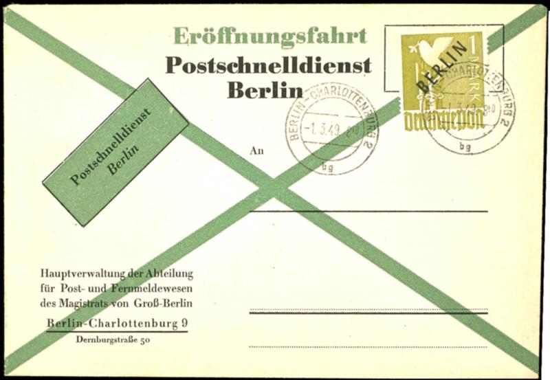 1 Mark black overprint on blank first day cover for the opening of the express postal service, Michel 750.- (17) 1 Mark Schwarzaufdruck auf Blanko-Ersttagsbrief zur Eröffnung des Postschnelldienstes, Mi. 750.- (Image)