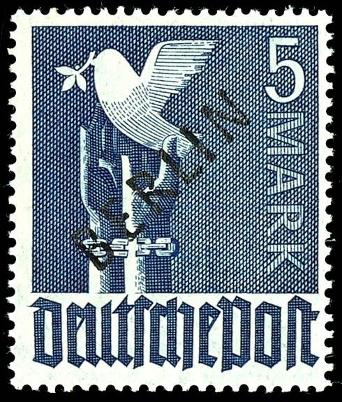 5 Mark black overprint, printing error IVa \R broken\, occurring only in a partial edition, mint never hinged, flawless condition, certified by Schlegel BPP, Michel 750.- (20AFIVa) 5 Mark Schwarzaufdruck, Aufdruckfehler IVa \R gebrochen\ nur in einer Teilauflage vorkommend, postfrisch, tadellose Erhaltung, geprüft Schlegel BPP, Mi. 750.- (Image)