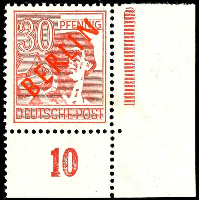 30 Pfennig red overprint, printing error I \L with apostrophe\, corner piece bottom right = field 100, mint never hinged, flawless condition, unsigned, Michel 400.- (28I) 30 Pfennig Rotaufdruck, Aufdruckfehler I \L mit Apostroph\, Eckrandstück unten rechts = Feld 100, postfrisch, tadellose Erhaltung, unsigniert, Mi. 400.- (Image)