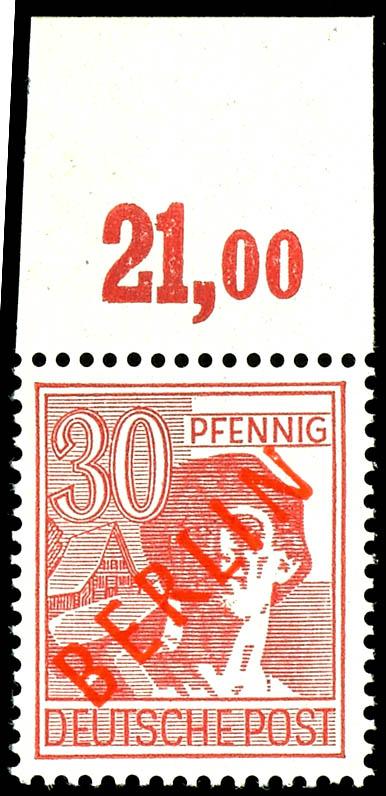30 Pfennig red overprint, plate printing upper margin block, not perforated, mint never hinged, flawless condition, expertized by Schlegel BPP, Michel 350.- (28PORndgz) 30 Pfennig Rotaufdruck, Plattendruckoberrandstück ndgz., postfrisch, tadellose Erhaltung, geprüft Schlegel BPP, Mi. 350.- (Image)