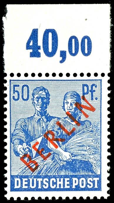 50 Pfennig Red overprint, plate printing top marginal block, not perforated, mint never hinged, flawless condition, expertized by Schlegel BPP, Michel 400.- (30PORndgz) 50 Pfennig Rotaufdruck, Plattendruckoberrandstück ndgz., postfrisch, tadellose Erhaltung, geprüft Schlegel BPP, Mi. 400.- (Image)