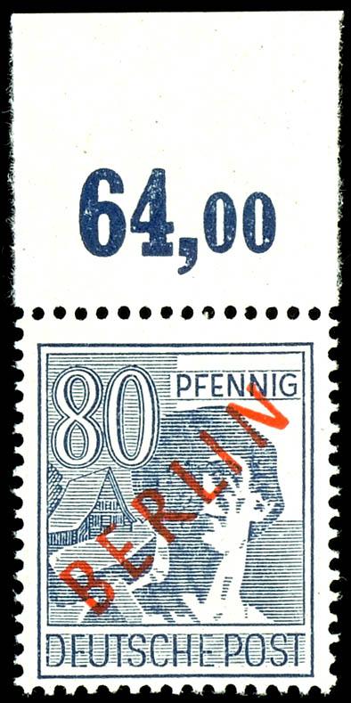80 Pfennig Red overprint, plate printing top marginal block, not perforated, mint never hinged, flawless condition, expertized by Schlegel BPP, Michel 500.- (32PORndgz) 80 Pfennig Rotaufdruck, Plattendruckoberrandstück ndgz., postfrisch, tadellose Erhaltung, geprüft Schlegel BPP, Mi. 500.- (Image)