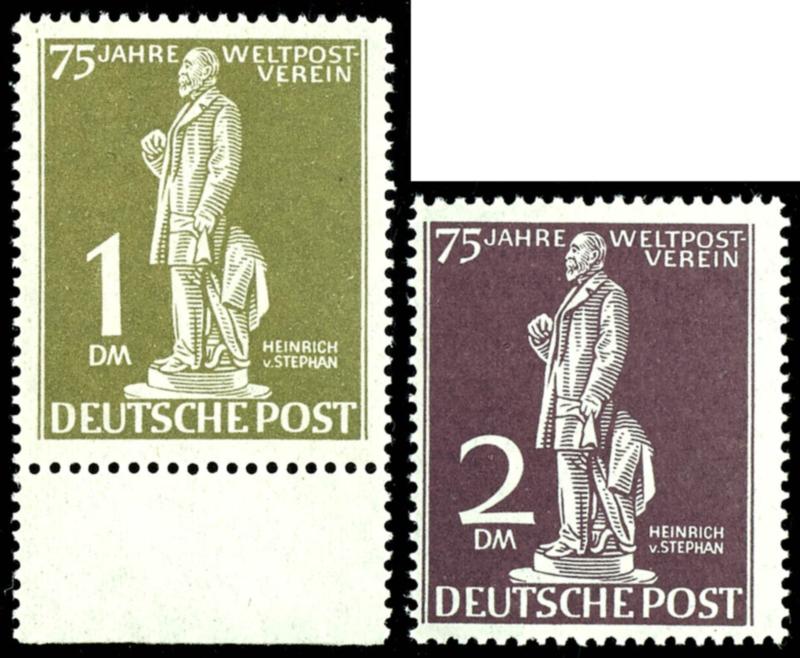 75 years of the UPU, complete set, plus 2 stamps with printing error I \Protrusion at the bottom of the monument base\, used, Michel 720.- (35/41,41I) 75 Jahre UPU kpl. und zusätzlich 2 Mark mit Plattenfehler I \Ausbuchtung unten am Denkmalssockel\, gest., Mi. 720.- (Image)