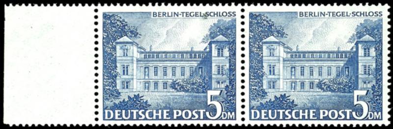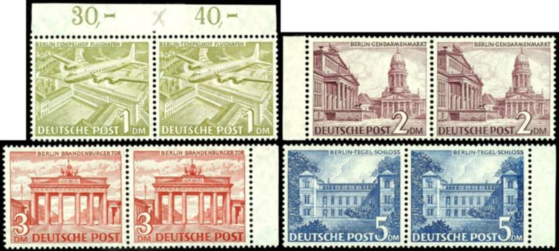 1 Pfennig to 5 Mark designs (I), (II) and (III), each in a vertical pair of 24 values, mint, the edges of the marginal pairs are pre-folded, six values of the Pfennig denominations with nibbed perforation, otherwise flawless condition, photo certificate Hans-Dieter Schlegel BPP, Michel 2. 940.- (starting price 500) (42/60,112/3,121/3) Certificate 1 Pfennig bis 5 Mark Bauten (I), (II) und (III), je im senkrechten Paarsatz mit insgesamt 24 Werten, postfrisch, bei den Randpaaren sind die Ränder vorgefaltet, sechs Werte der Pfennig-Wertstufen mit kurzen Zähnen, sonst tadellose Erhaltung, Fotoattest Hans-Dieter Schlegel BPP, Mi. 2.940.- (alter Ausruf 500) (Image)