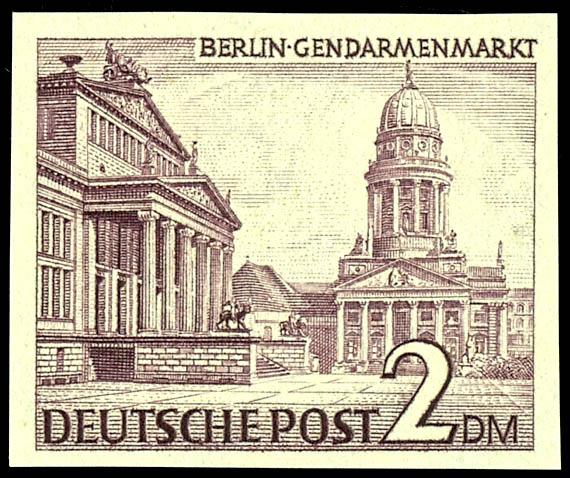 2 Mark Berliner Bauten I, imperforate proof on ungummed, greenish paper, flawless condition, Michel 500.- (58P) 2 Mark Berliner Bauten I, ungezähnter Probedruck auf ungummiertem, grünlichem Papier, tadellose Erhaltung, Mi. 500.- (Image)