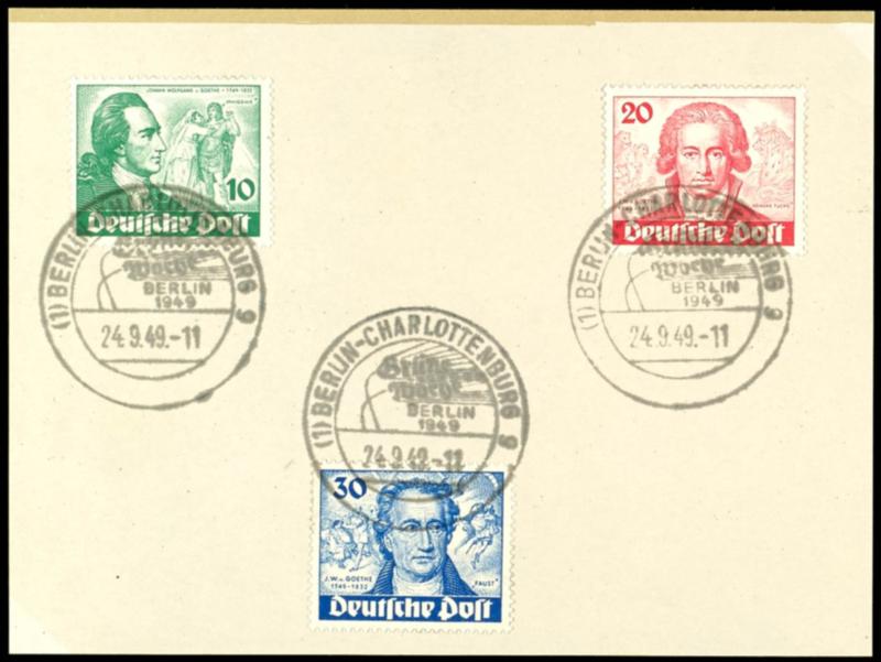 10 Pfennig to 30 Pfennig, 200th birthday of Johann Wolfgang von Goethe, complete set of three values, neatly on backing with three clear special postmarks \BERLIN CHARLOTTENBURG 9 Gruene Woche Berlin 1949, 24. 9. 49\, flawless condition, photographic finding Hans-Dieter Schlegel BPP \The quality is impeccable.\ (61/63) Certificate 10 Pfennig bis 30 Pfennig 200. Geburtstag von Johann Wolfgang von Goethe, kompletter Satz mit drei Werten, sauber auf Unterlage mit drei klaren Sonderstempel \BERLIN CHARLOTTENBURG 9 Grüne Woche Berlin 1949, 24.9.49\, tadellose Erhaltung, Fotobefund Hans-Dieter Schlegel BPP \Die Qualität ist einwandfrei.\ (Image)