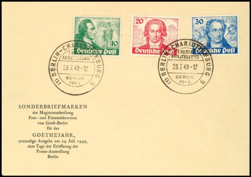10 Pfennig to 30 Pfennig Goethe on official blank FDC with first day special postmark \BERLIN-CHARLOTTENBURG 29. 7. 49\, flawless condition, Michel 700.- (61/63) 10 Pfennig bis 30 Pfennig Goethe auf amtlichem Blanko-FDC mit Ersttagssonderstempel \BERLIN-CHARLOTTENBURG 29.7.49\, tadellose Erhaltung, Mi. 700.- (Image)