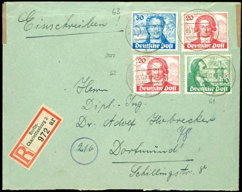 10 Pfennig, 20 Pfennig (2) and 30 Pfennig Goethe as postage franking on a registered letter from \BERLIN 06. 12. 49\ to Dortmund with arrival stamp dated 09. 12. 49, postal markings, quite rare postal representation. (61/63) 10 Pfennig, 20 Pfennig (2) und 30 Pfennig Goethe als portogerechte Frankatur auf R-Brief von \BERLIN 06.12.49\ nach Dortmund mit Ankunftsstempel vom 09.12.49, Beförderungsspuren, recht seltene Portodarstellung. (Image)