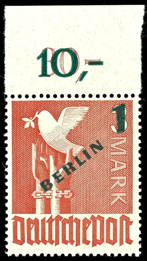 1 Mark green surcharge with unfolded plate printing top margin, flawless and unsigned, Michel 400.- (67POR) 1 Mark Grünaufdruck mit ungefaltetem Plattendruck-Oberrand, tadellos unsigniert, Mi. 400.- (Image)