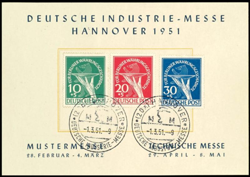 10 Pfennig to 30 Pfennig currency damaged, complete set of three values on a commemorative card \German Industry Fair Hanover 1951\ with corresponding special postmark from March 1, 1951, flawless, expertized by Schlegel D. BPP, Michel 600.- (68/70) 10 Pfennig bis 30 Pfennig Währungsgeschädigte, kompletter Satz mit drei Werten auf Erinnerungskarte \Deutsche Industrie Messe Hannover 1951\ mit entsprechendem Sonderstempel vom 1.3.51, tadellos, geprüft Schlegel D. BPP, Mi. 600.- (Image)
