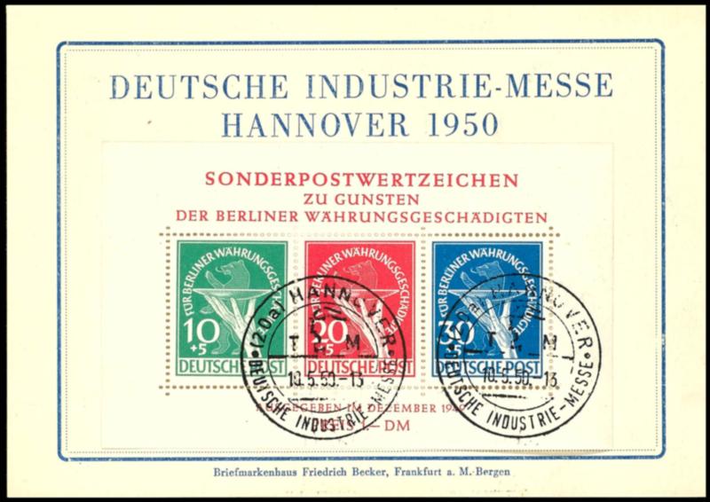 Block of 1, cancelled with a special postmark \HANNOVER DEUTSCHE INDUSTRIEMESSE\ on a blank card, excellent condition, photo certificate by Schlegel BPP, Michel 2200. (Block 1) Certificate Block 1, entwertet mit Sonderstempel \HANNOVER DEUTSCHE INDUSTRIEMESSE\ auf Blankokarte, tadellose Erhaltung, Fotoattest Schlegel BPP, Mi. 2200 (Image)