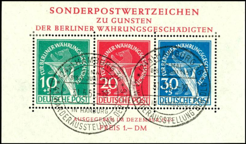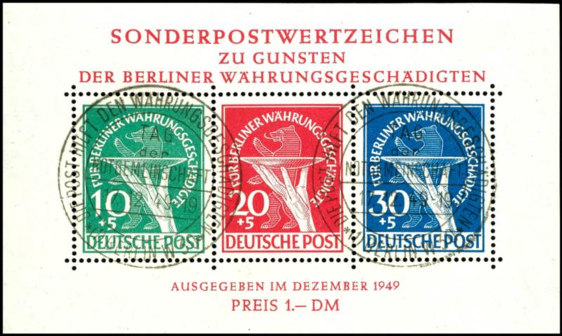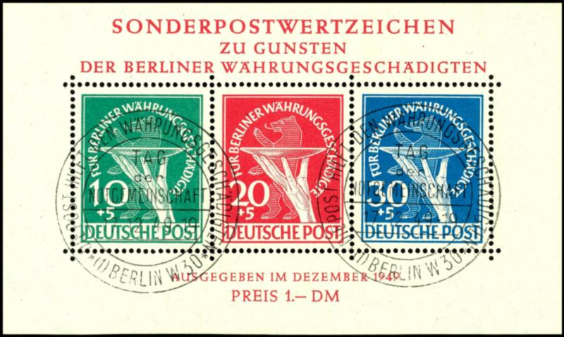 Block issue \For Victims of Currency Damage in Berlin\ with first day special cancellation mark \Berlin W30 17. 12. 49\, flawless condition, certified by Schlegel BPP (previous bid 500). (Bl.1) Blockausgabe \Für Berliner Währungsgeschädigte\ mit Ersttags-Sonderstempel \Berlin W30 17.12.49\, tadellose Erhaltung, geprüft Schlegel BPP (alter Ausruf 500) (Image)