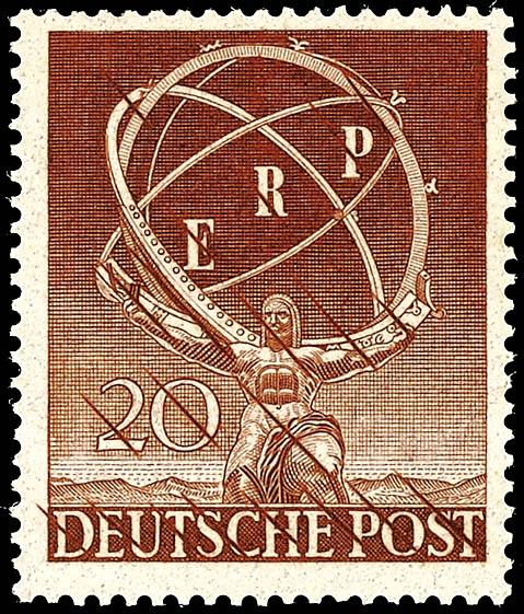 20 Pfg ERP as a trial print in the color dark yellowish-brown, perfectly mint never hinged, expertized by Schlegel BPP, Michel 1. 000.- (71P) 20 Pfg ERP als Probedruck in der Farbe Schwärzlichgelbbraun, tadellos postfrisch, gepr. Schlegel BPP, Mi. 1.000.- (Image)