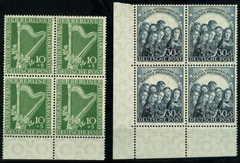 10 Pfennig and 30 Pfennig \Reconstruction of the Berlin Philharmonic\, block of four with both values from the lower margin, mint never hinged, flawless condition, Michel 560.- + (72/73(4)) 10 Pfennig und 30 Pfennig \Wiederaufbau der Berliner Philharmonie\, Viererblocksatz mit beiden Werten je vom unteren Bogenrand, postfrisch, tadellose Erhaltung, Mi. 560.-+ (Image)