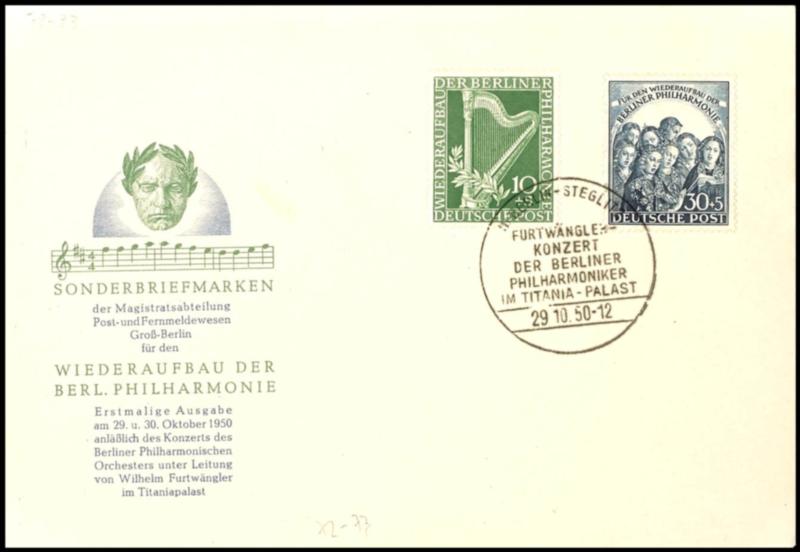 10 Pfg and 30 Pfg Philharmonic, official blank FDC with first day special postmark \BERLIN 29. 10. 50\, flawless condition, slight traces of adhesion on the reverse (insignificant), Michel 300.- (72/73FDC) 10 Pfg und 30 Pfg Philharmonie, amtlicher Blanko-FDC mit Ersttagssonderstempel \BERLIN 29.10.50\, tadellose Erhaltung, rück. leichte Anhaftungen (unbedeutend), Mi. 300.- (Image)